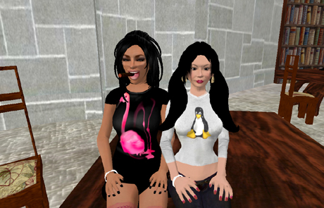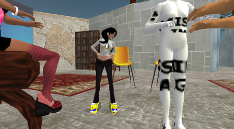 In this screenshot you can see my new duckie shoes. Moo and I are both wearing white “Stand Up” bracelets to support the global fight against poverty. I forgot to ask Moo what inspired her to think up such a name in the first place. I wonder if she got it from the musical RENT, where Maureen sings about how people should “moo” to fly over moon because “in cyberland, all they drink is diet coke.” Second Life, however, is more than cyberland and the availability of drinks is certainly not limited to diet coke!