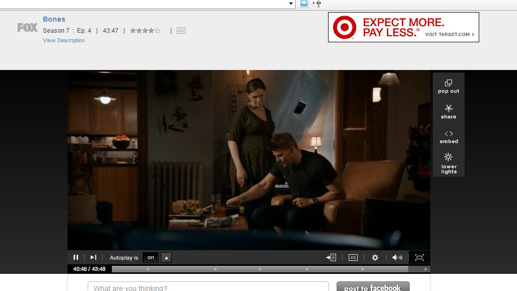 In a recent episode of Bones (The Male in the Mail), actress Emily Deschanel wears an green maternity dress in the final scene that is from the Liz Lange maternity collection at Target. Interestingly, on Hulu, the banner ad accompanying the episode was Target. If this is product placement, it’s certainly the most subtle form of product placement I’ve seen.