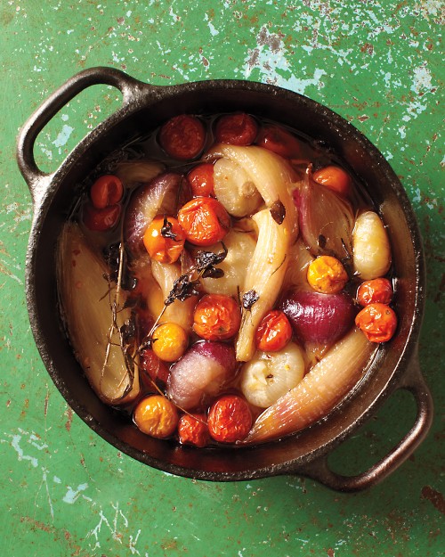 - Peel onions (this is the hardest part of the recipe). Heat oil in a small Dutch oven or other heavy 3-quart pot over medium-high heat (if too hot, the onions will burn). Add shallots and onions, tossing to coat, then bring to a simmer (about 10 min). Add tomatoes, rosemary, 1 tablespoon salt, and a pinch of red-pepper flakes (original recipe had oregano too, but I didn’t have any on hand). Preheat oven to 350 degrees. Cover, cook for another 20-30 min. Cover with lid or foil, and transfer to oven. I didn’t have a dutch oven so I just cooked the onions in a pot and then poured them into a casserole dish when putting them into the oven.