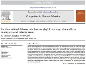 My colleague Yu-Hao and I have a new article out in Computers in Human Behavior about how cultural orientation affects people’s motivations to play social network games and how they play social network games (e.g., what they are doing in the game). One of the reasons that we did this study was because in our previous study, we found some very interesting differences in playing patterns between Asians and Whites. We also noticed that a lot of the literature looks at different nationalities and different patterns of play, but we didn’t like the idea of a race or nationality as being a good theoretical explanation for why people play differently.