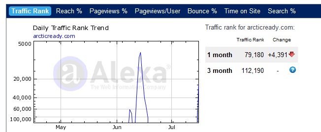 It seems like the social media campaign hasn’t really hurt stock prices. The surge in mid-June corresponds to the web traffic of the Arctic Ready website. The dip on July 9 may be due to the YouTube video, which was posted on July 7 (Saturday, market was closed) but the market quickly recovered and prices actually climbed further.