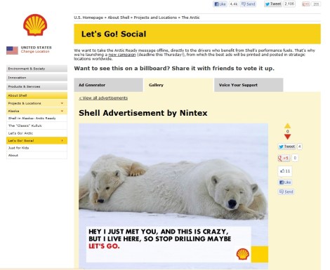 Let me back up and explain a little about the anti-Shell campaign, which has at least three major social media components. The first is a website that enabled users to add a snarky anti-oil-drilling message on cute pictures of arctic animals or beautiful arctic scenery (think LOLcats but with an anti-oil arctic theme).