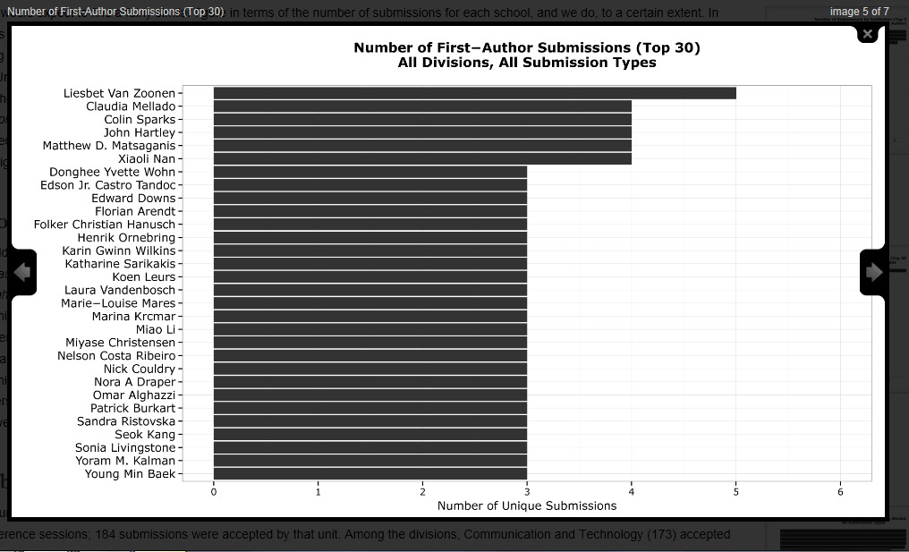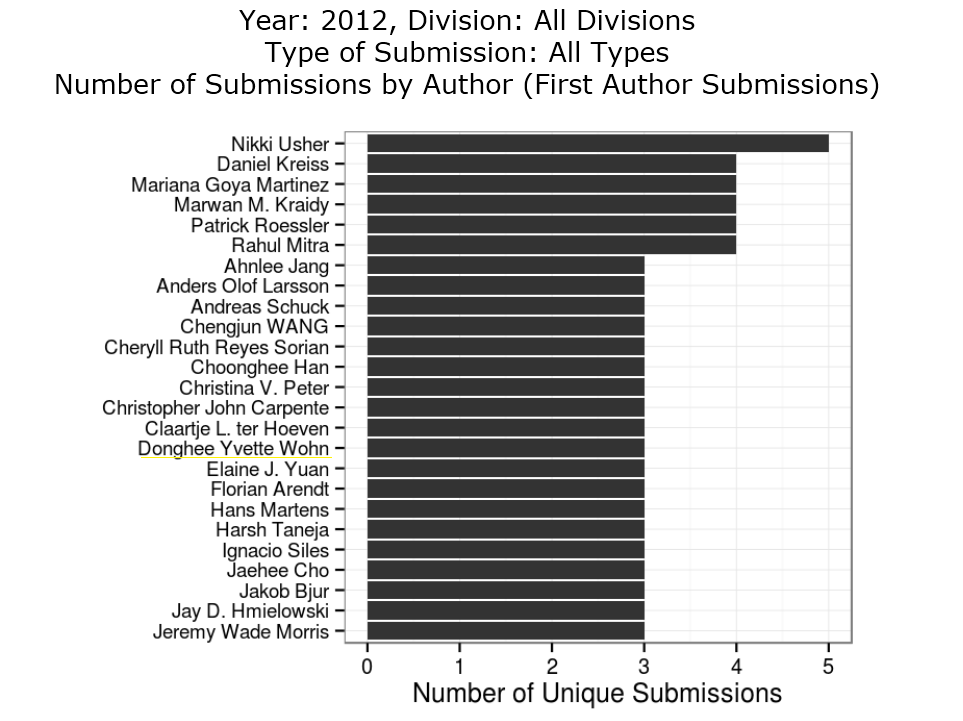 Aside from the conference, I also came across this blog by a doctoral student Rodrigo Zamith that visualizes author affiliations and paper topics based on “big” data. I was pleasantly surprised to see that I was in the top ten in terms of ICA paper productivity both this year and last year, regardless of whether you count unique submissions by first author, or submissions in general. These conference papers are being turned into archival publications, but interestingly enough, very few are actually going to Communication journals.