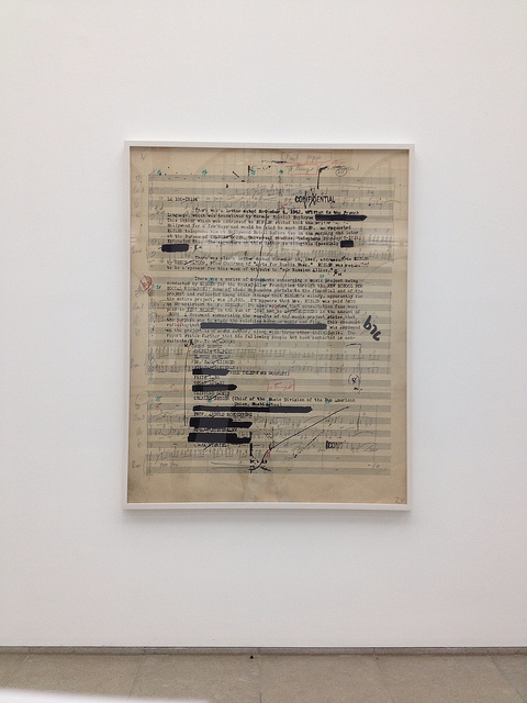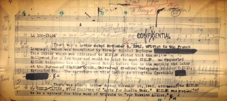 Based on three film music compositions by Eisler, Philipsz has developed a 24-channel sound installation. Recorded individually by live musicians in the studio, each tone is played separately on one of 24 loudspeakers installed in the hall. Through this acoustic work and 12 prints, in which pages from musical scores by Eisler are overlaid with pages from his FBI file, Philipsz attempts to convey Eisler’s aesthetic of “displaced form” while touching on themes such as life’s journey and the experience of surveillance, separation and displacement.