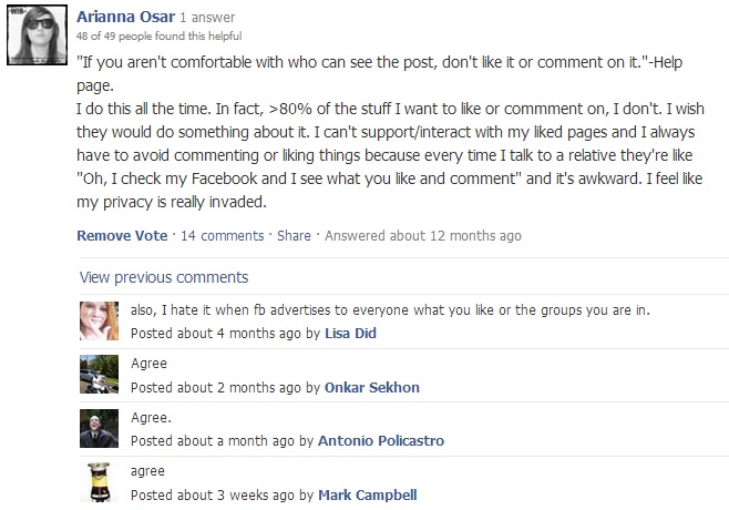 I would like to argue, however, that publicizing my Like to someone’s news feed is a violation of my privacy. It’s one thing for my “like” to be visible on someone else’s public post, but it is a completely different thing for that information to be conveyed to a third party- especially one that was designated as “restricted”! I was especially upset because in my profile, I specifically edited the section for “likes” so that “likes” can only be seen by me. My suspicion is that those “likes” only pertain to pages- so it is very misleading.